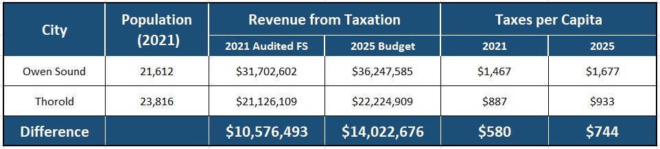 This is astonishing. Owen Sound residents and businesses pay over $10 million annually more than Thorold residents and businesses in property taxes!! For a city with fewer people!!